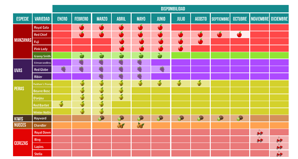 Dentro de las especies frutales producidas y exportadas por Disfruta se encuentran distintos tipos de manzana, uva, pera, kiwi, cereza y nuez.